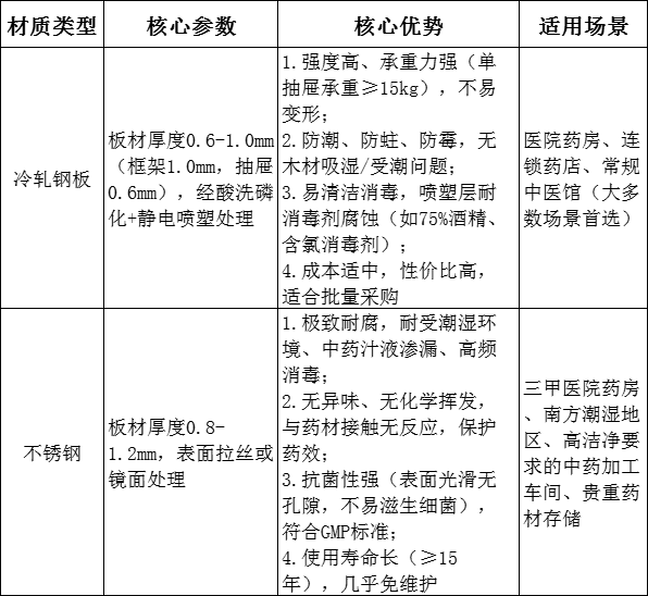 鋼制中藥柜的核心競(jìng)爭(zhēng)力源于材質(zhì)本身,主流采用冷軋鋼板或不銹鋼,經(jīng)專業(yè)工藝處理后,具備以下特性: